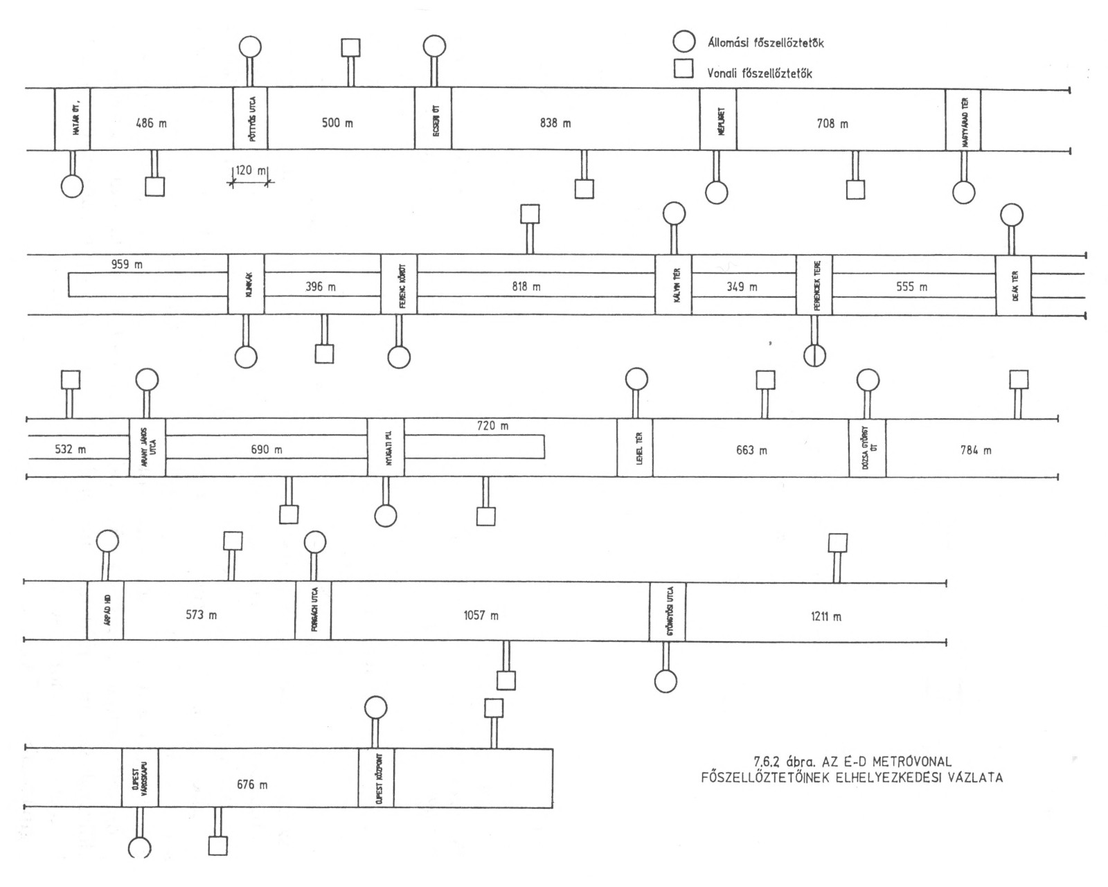A főszellőztető berendezések a metró szellőztető rendszerének azon első számú részegységei, amelyeken át a mesterségesen keringtetett levegő az alagutakba vagy az alagutakból a felszínre jut. A főszellőztetés szívó-nyomó rendszerű. Ez azt jelenti, hogy mind a friss, mind az elhasznált levegőt ventilátorok szállítják be vagy ki. A ventillátorok a friss levegőt az állomások szellőztető aknáin szívják be, és a két állo- más között elhelyezkedő aknán juttatják vissza a szabadba (vagy fordítva). Előbbit állomási, utóbbit vonali főszellőztetőnek nevezik, elhelyezkedéseiket a 7.6.1 és 7.6.2 ábrák szemléltetik. Állomási főszellőztető minden mély vagy felszínalatti állomáson van, vonali azonban nem épült minden állomásközben. Ennek oka általában az, hogy a főváros beépítettsége több helyen nem tette lehetővé a vonali főszellőztető megépítését, felszínre vezetését.